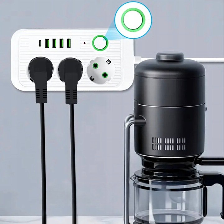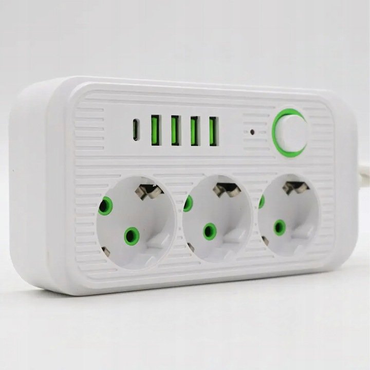gniazd: 3 × 2P+E (250V)⚡ Porty USB: 4 × USB-A, 1 ×